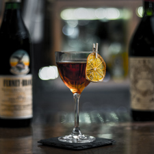 Ingredients: - 40ml Antica Formula - 40ml Broker's London Dry Gin - 2 dashes Fernet Branca